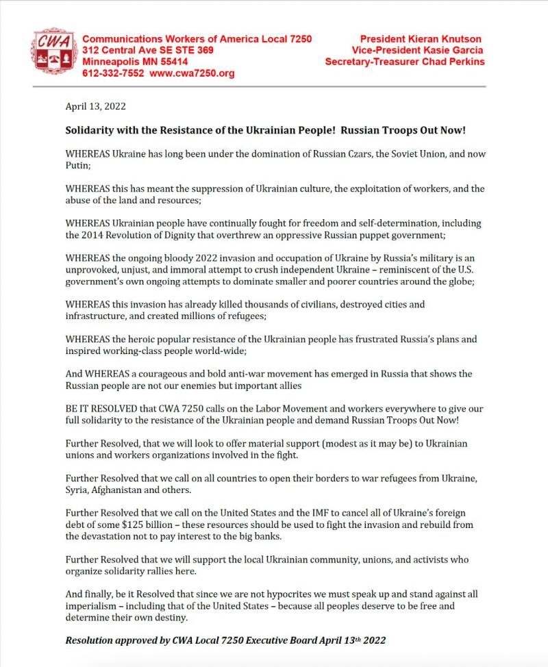 And be it resolved that we will consider and facilitate conversations among members about affiliation with the Ukraine Solidarity Campaign, a UK-based organization of trade unionists seeking to be in solidarity with Ukrainian trade unionists;